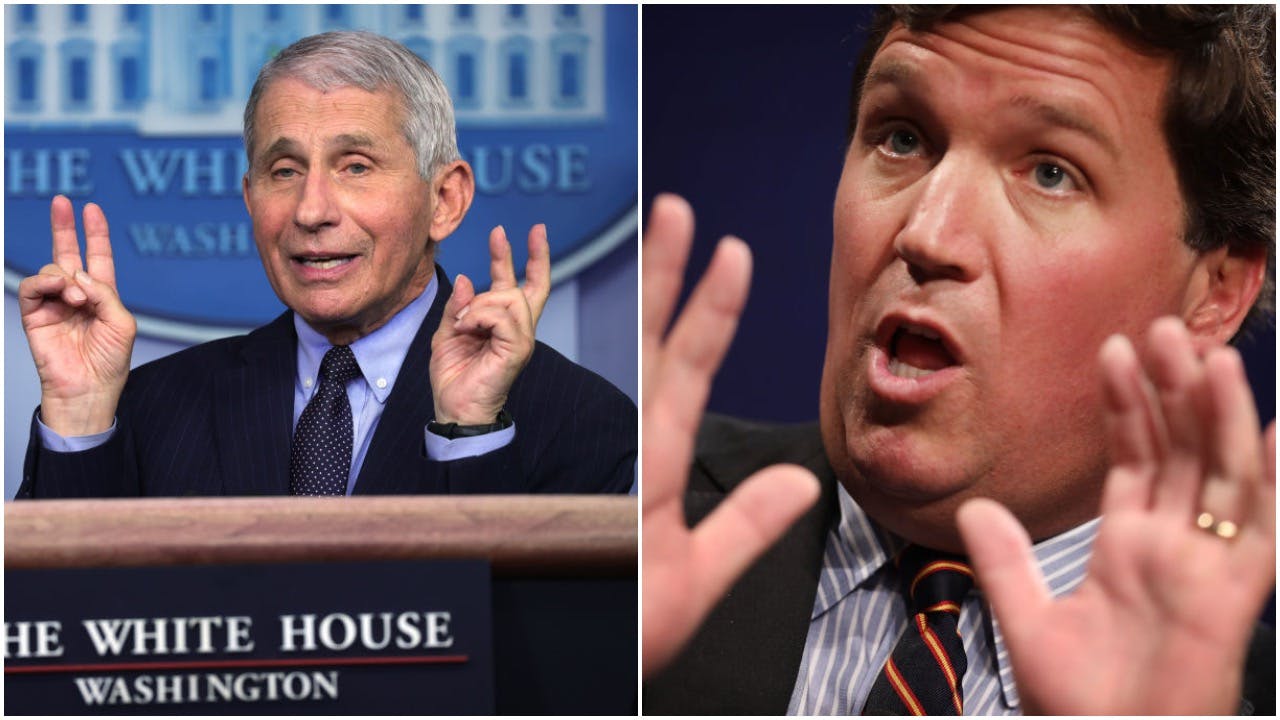 Fox News host Tucker Carlson described Dr. Anthony Fauci on Wednesday as “a malignant buffoon” for having repeatedly changed his talking points over masks during the past year.