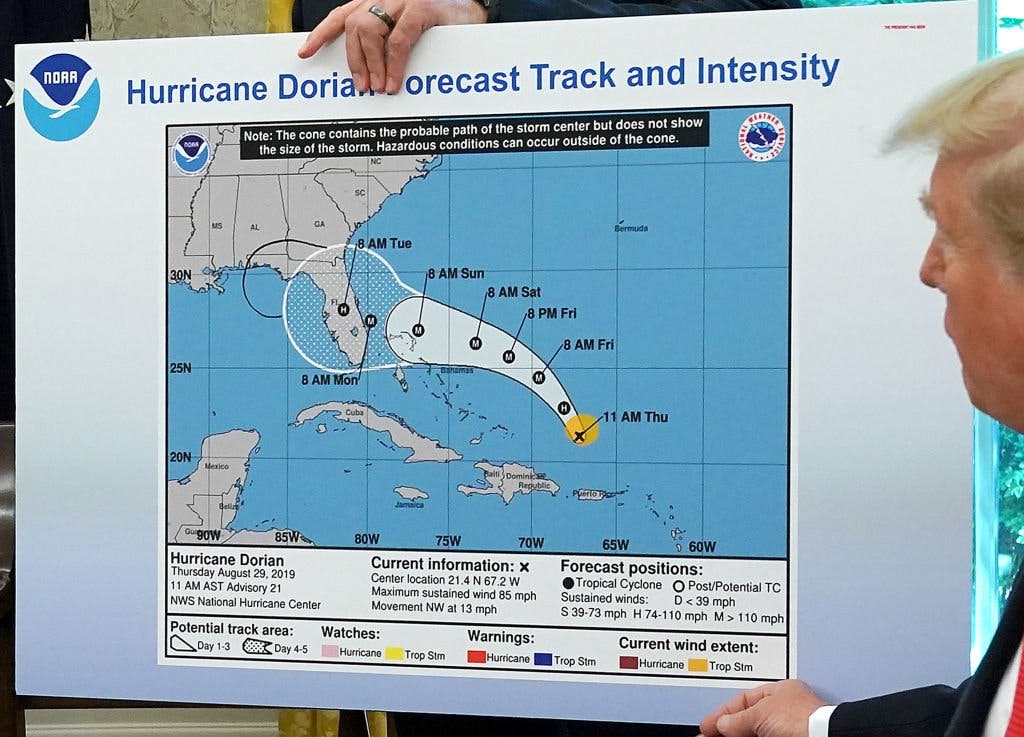 The inclusion of Alabama, which was in fact included in some early projections, but by the time Trump posted the tweet was considered safely out of the storm’s potential path, prompted the National Weather Service (NWS) Birmingham to tweet out a correction: “Alabama will NOT see any impacts from #Dorian. We repeat, no impacts from Hurricane #Dorian will be felt across Alabama. The system will remain too far east.”