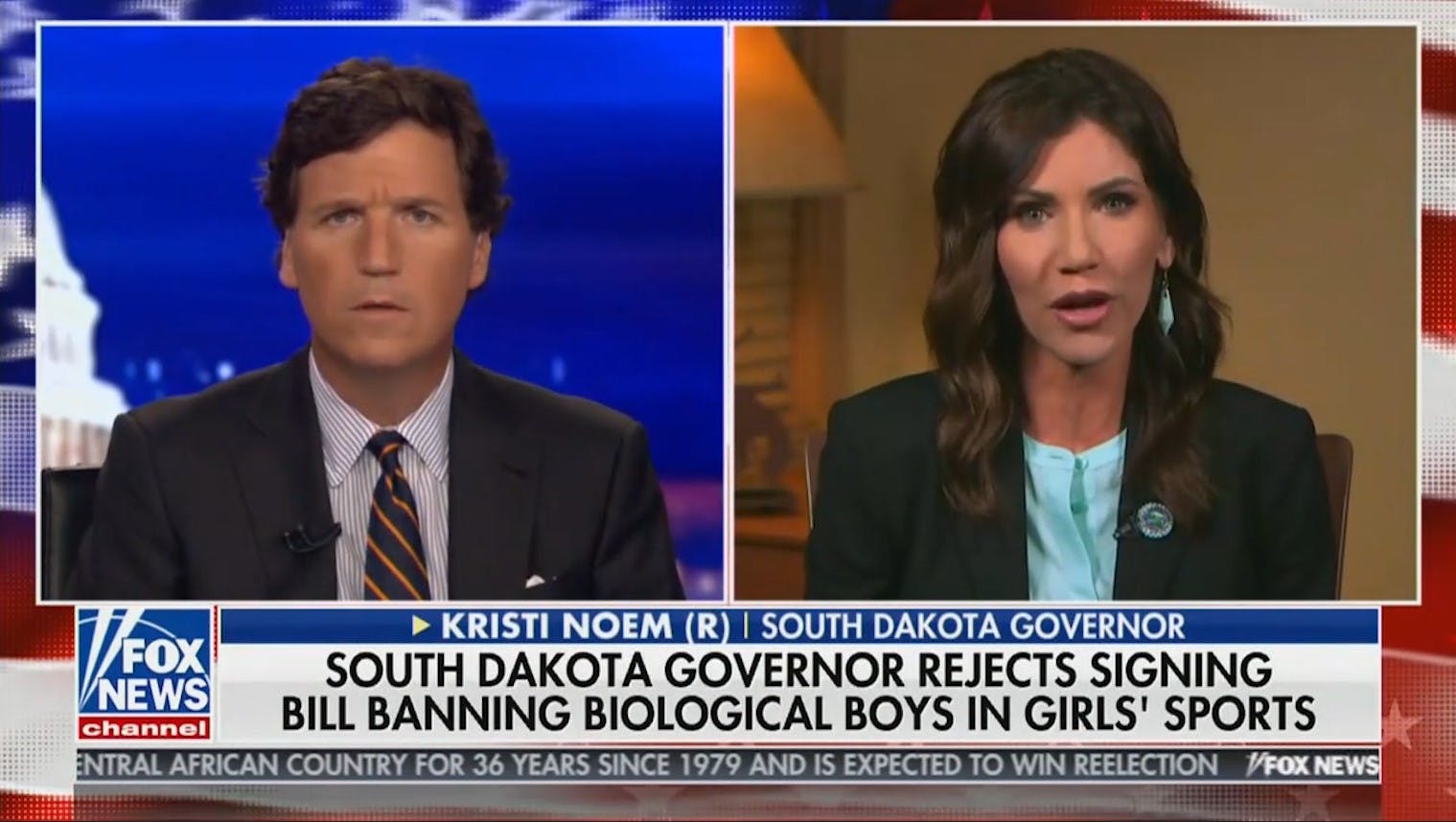 Tucker Carlson and South Dakota Governor Kristi Noem debate her decision to send a bill to ban biological men from playing girls sports back to the state legislature: