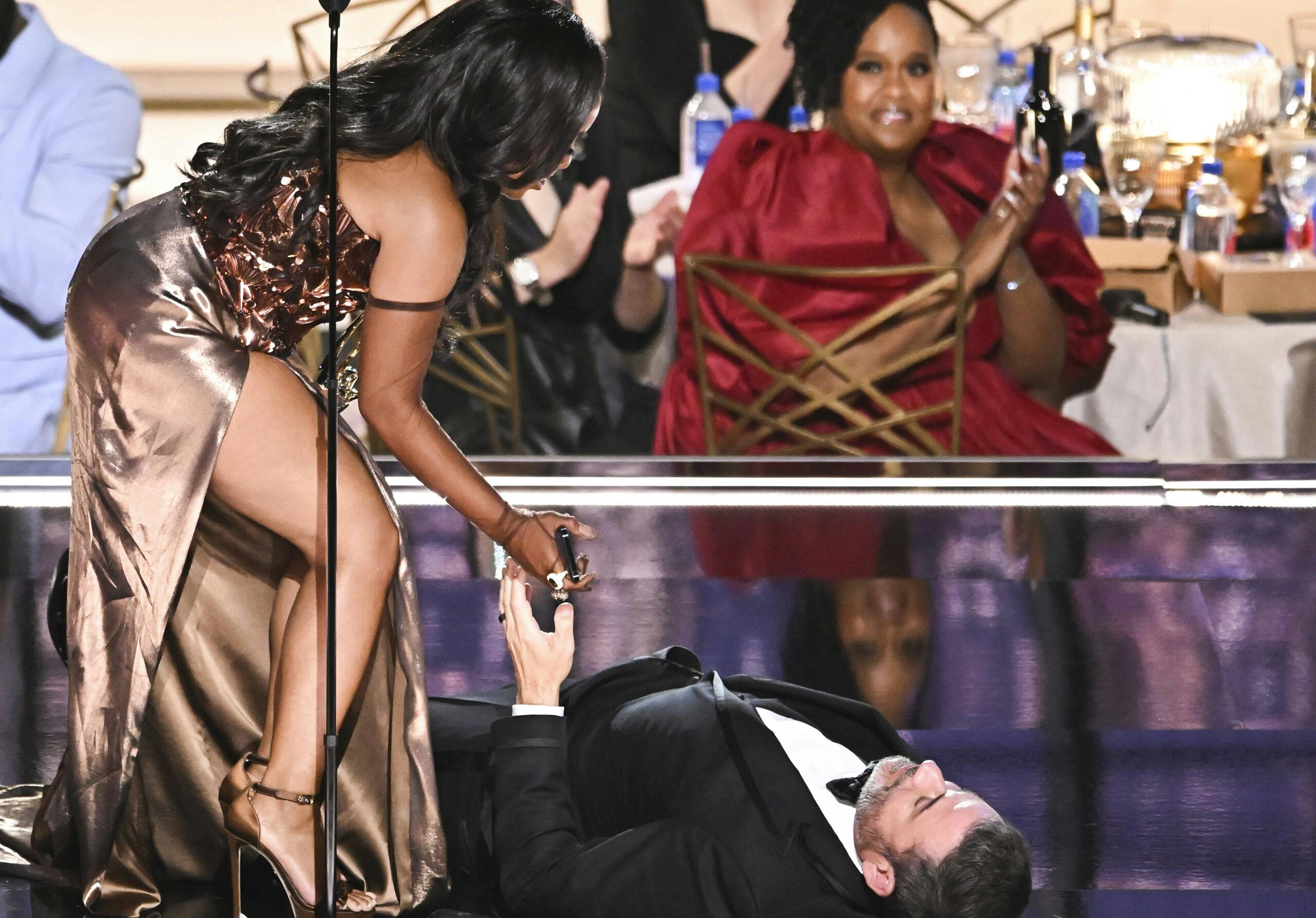 Kimmel got dragged out onto the stage by actor Will Arnett, who then announced the winner for best writing in a comedy series. Series creator and writer Quinta Brunson looked down at Kimmel playing dead on stage and said, “Jimmy, wake up. I won. Jimmy?” But Kimmel didn’t budge, instead committing to the bit for the entirety of her speech.